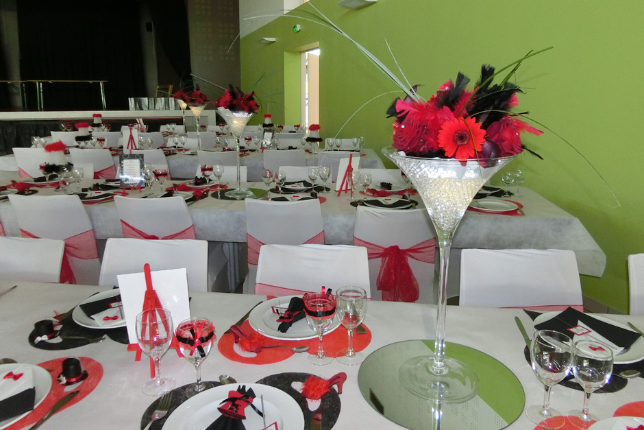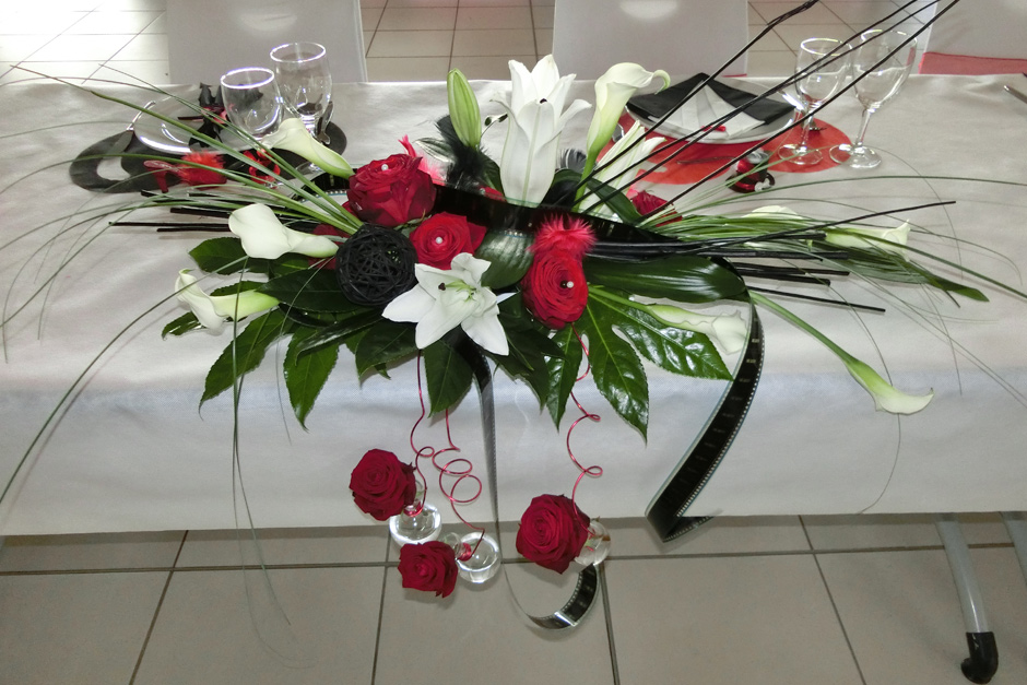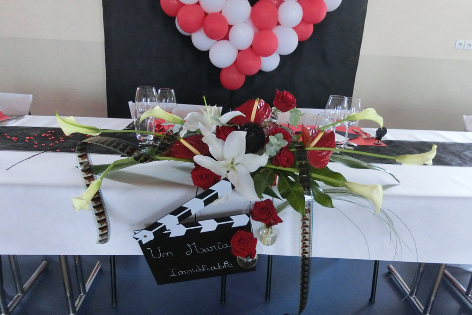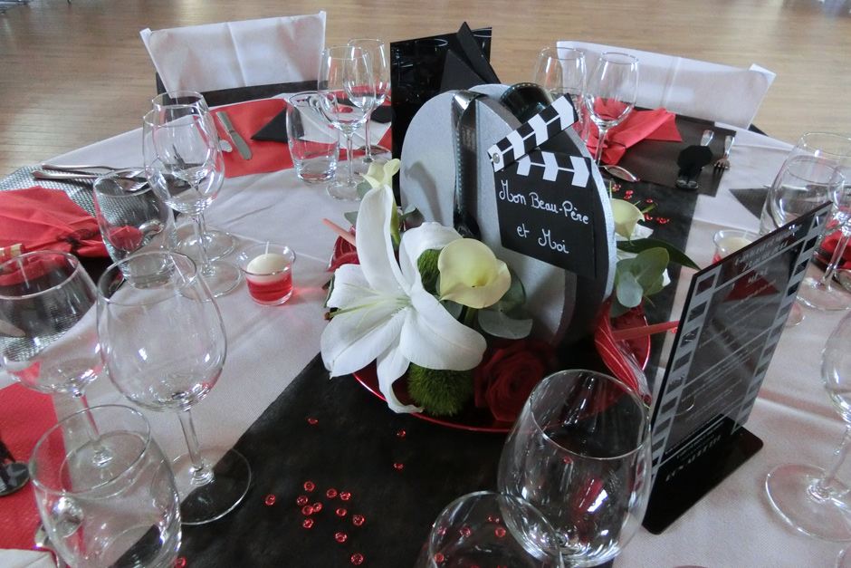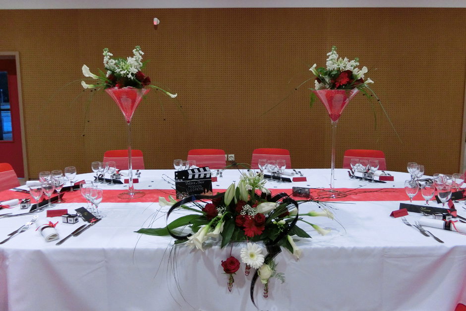 Les mariés font leur show ! Rouge, noir et blanc pour les tons ! Plumes, paillettes, bobine film et strass pour les accessoires ! Les fleurs : orchidées blanches, roses rouges, lys blancs, arums blancs Composition de fleurs dans des vases martini lumineux ou pas, rappel de bobine de film dans les compositions, plumes … |