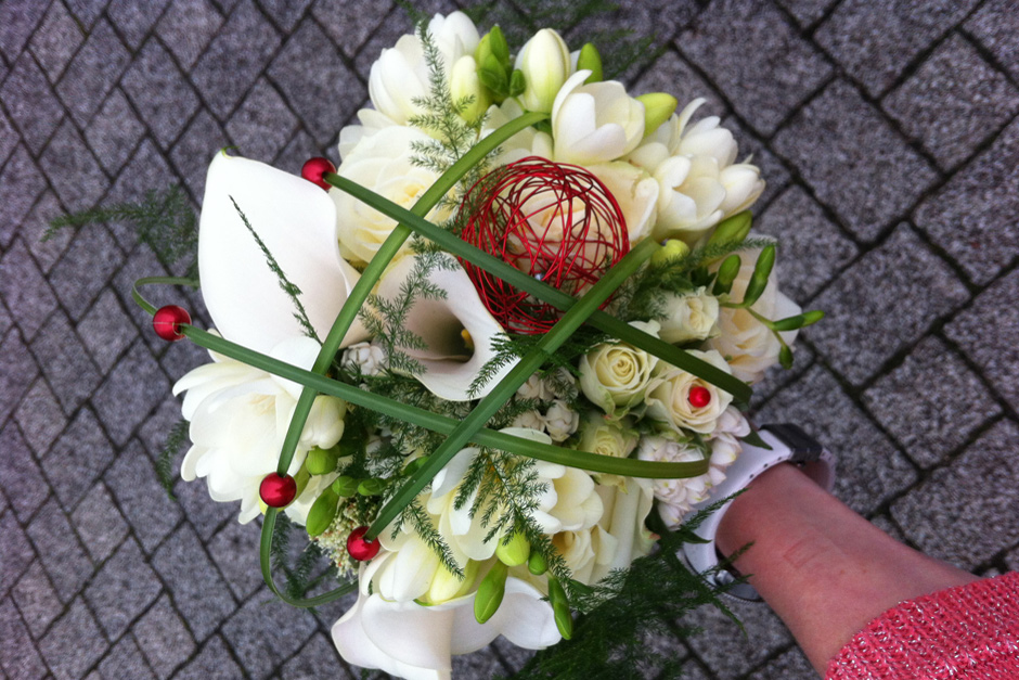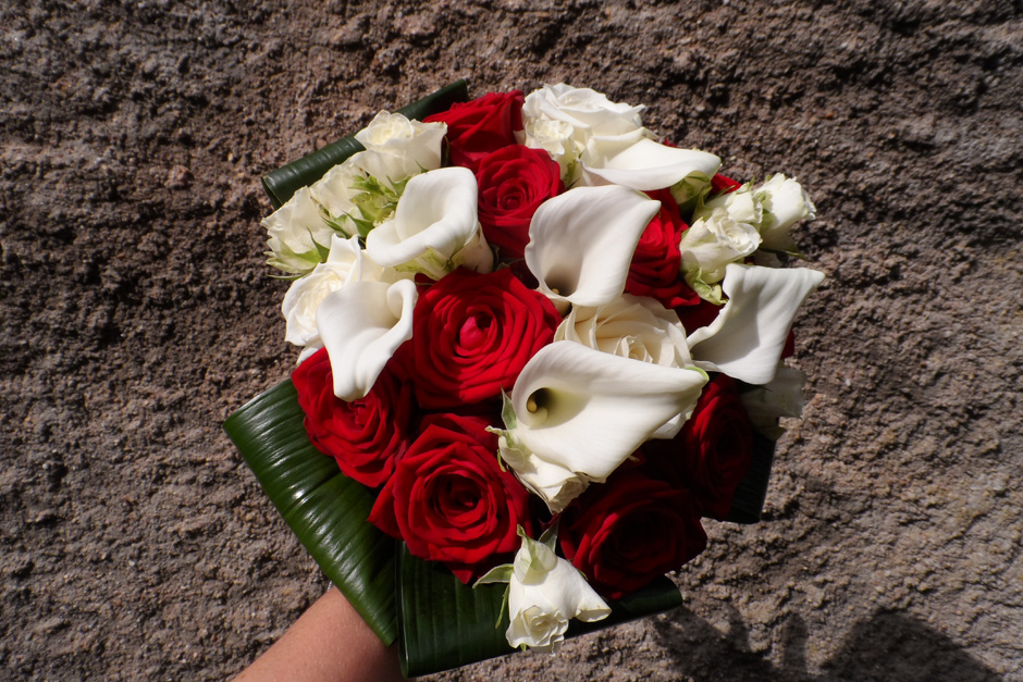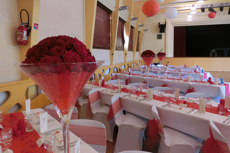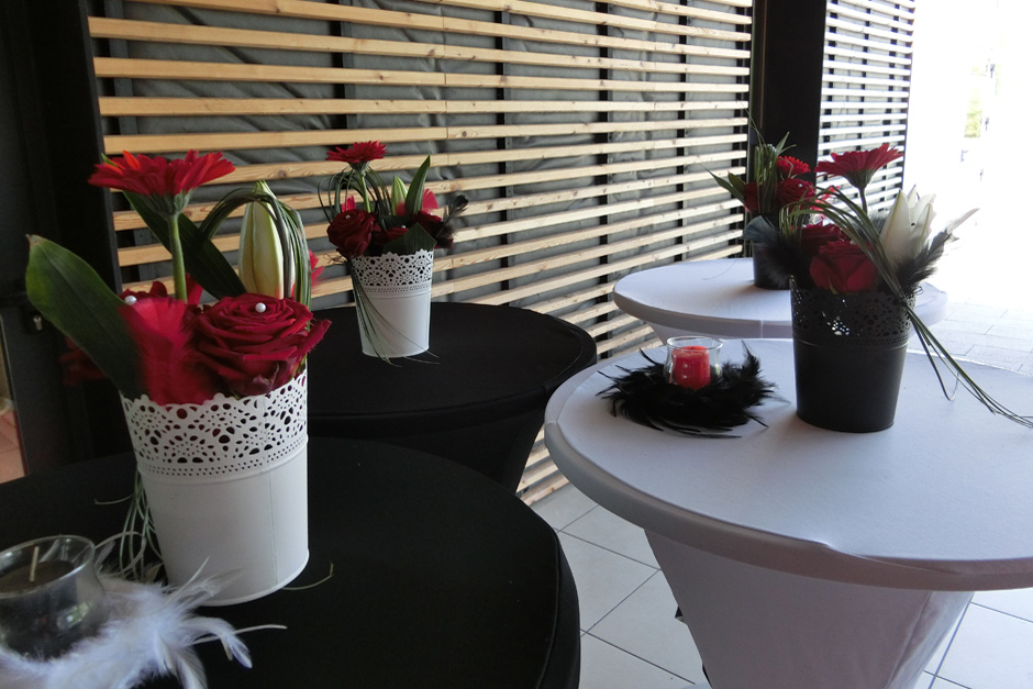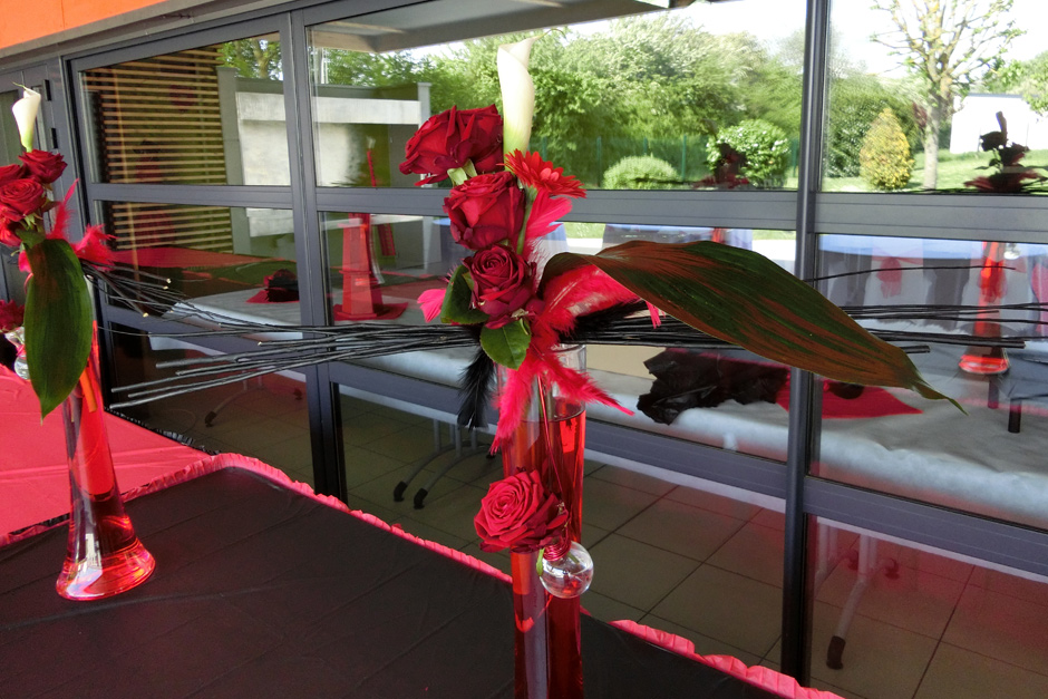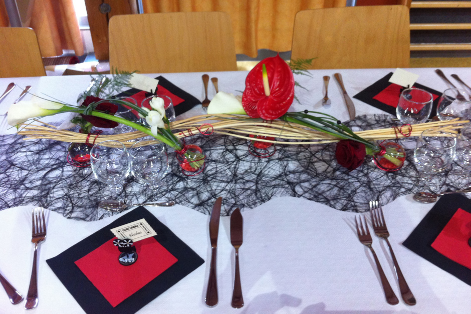 Les mariés font leur show ! Rouge, noir et blanc pour les tons ! Plumes, paillettes, bobine film et strass pour les accessoires ! Les fleurs : orchidées blanches, roses rouges, lys blancs, arums blancs Composition de fleurs dans des vases martini lumineux ou pas, rappel de bobine de film dans les compositions, plumes … |